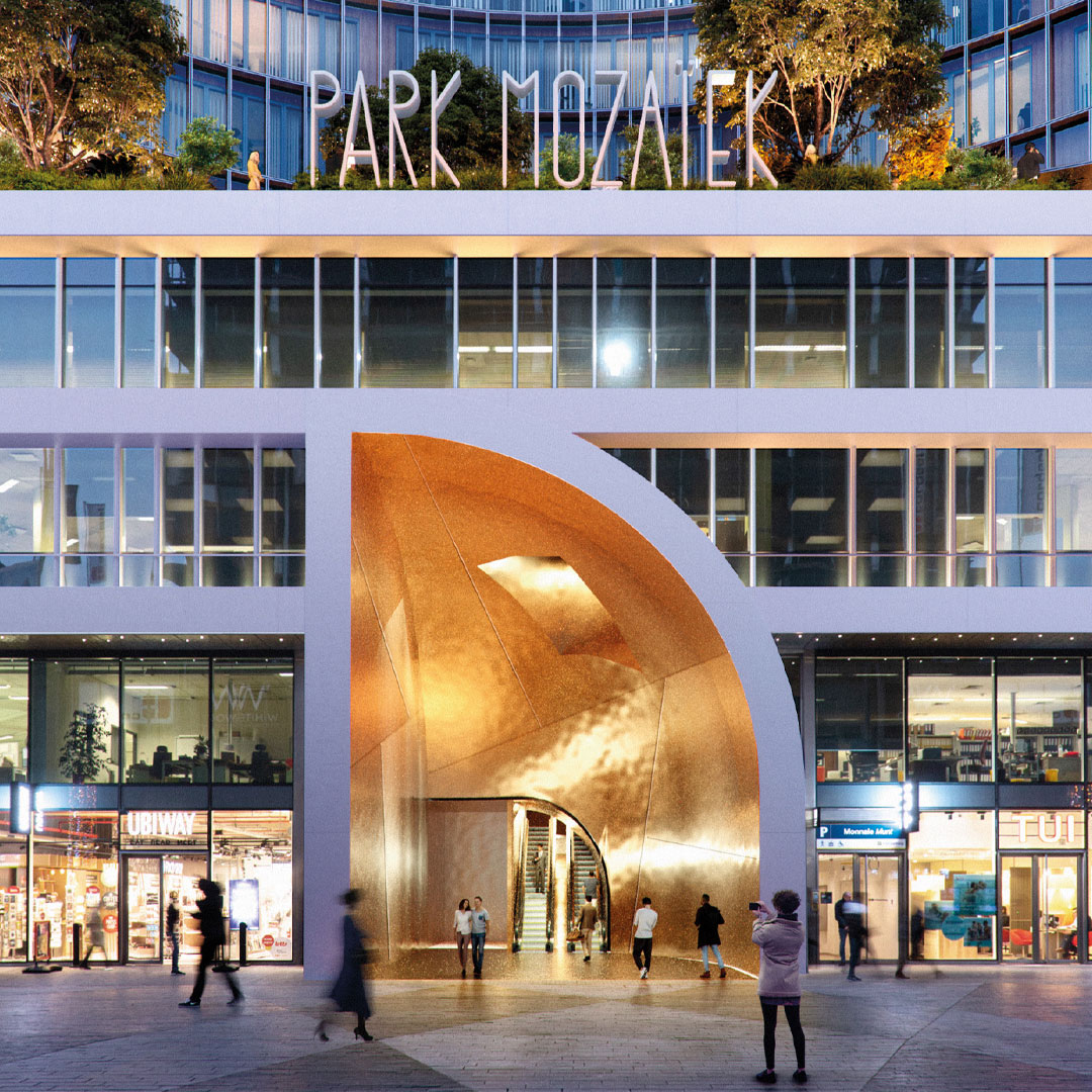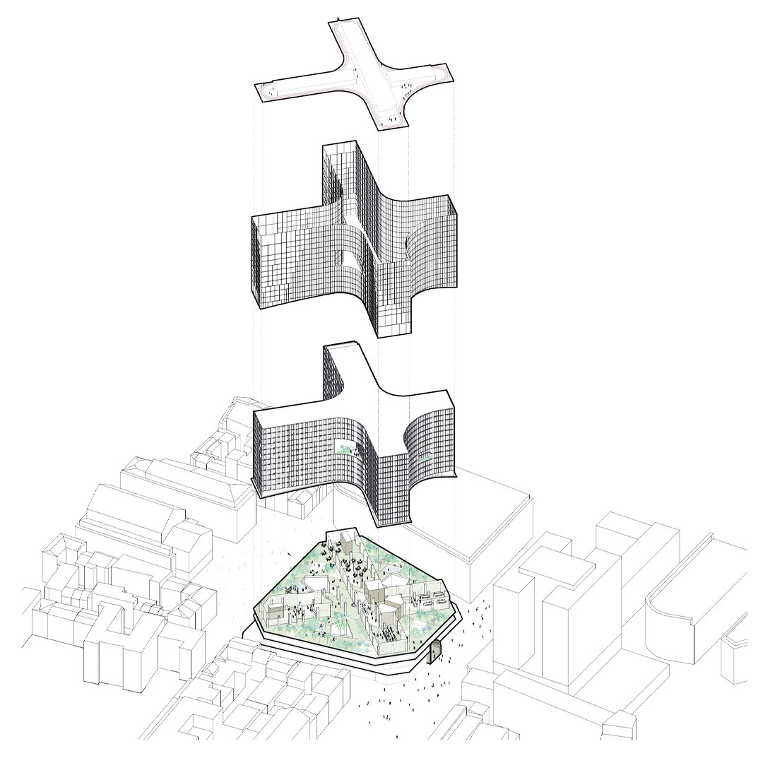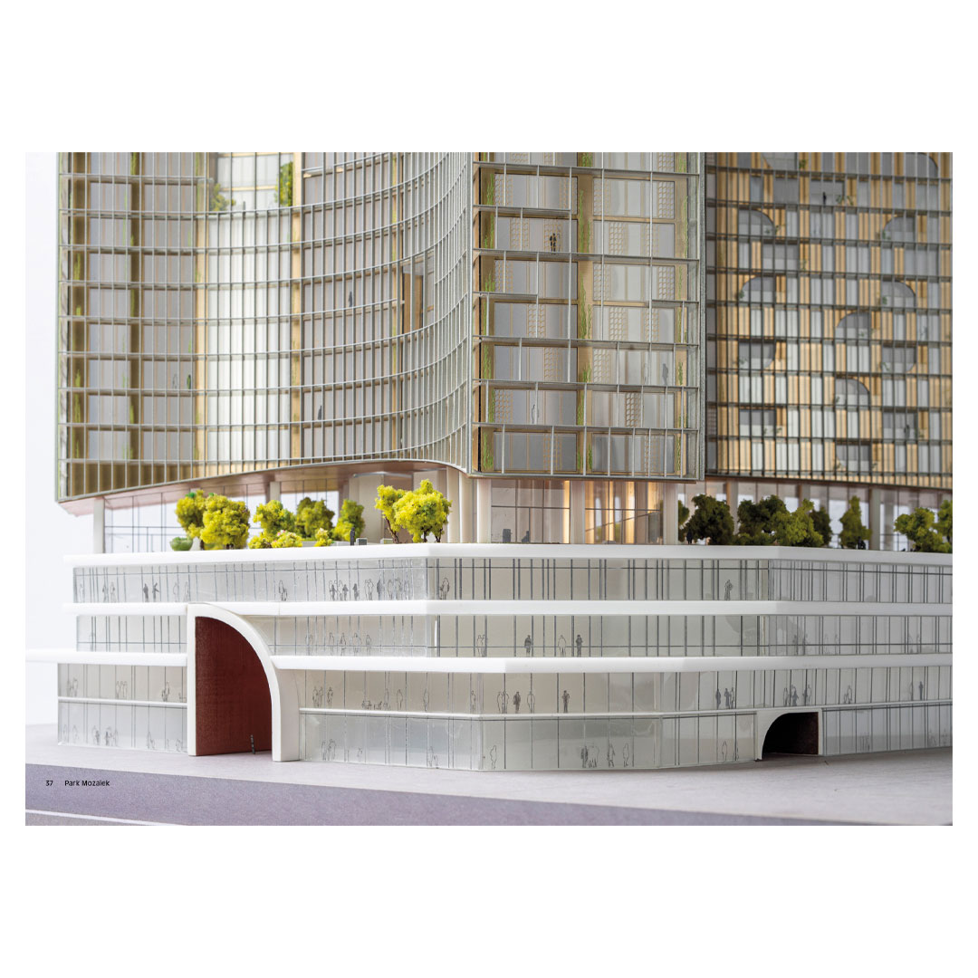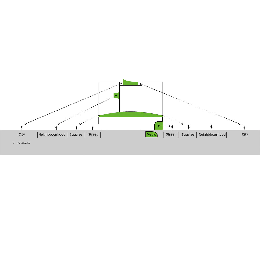 Park Mozaïek is buitenruimte én binnenruimte, met als hart een publiek park dat het totale basement van de torens beslaat. Om ruimte te maken voor deze groene zone halen we onder de benen van het gebouw twee lagen weg. Zo ontstaat een open, maar door de gebogen benen ook geborgen ruimte, van maar liefst 5000 m2. Om dat voor elkaar te krijgen ontwerpen we een reeks van gerichte ontwerpingrepen die op alle schaalniveaus leiden tot meer en betere verbindingen van deze plek met de stad rondom.