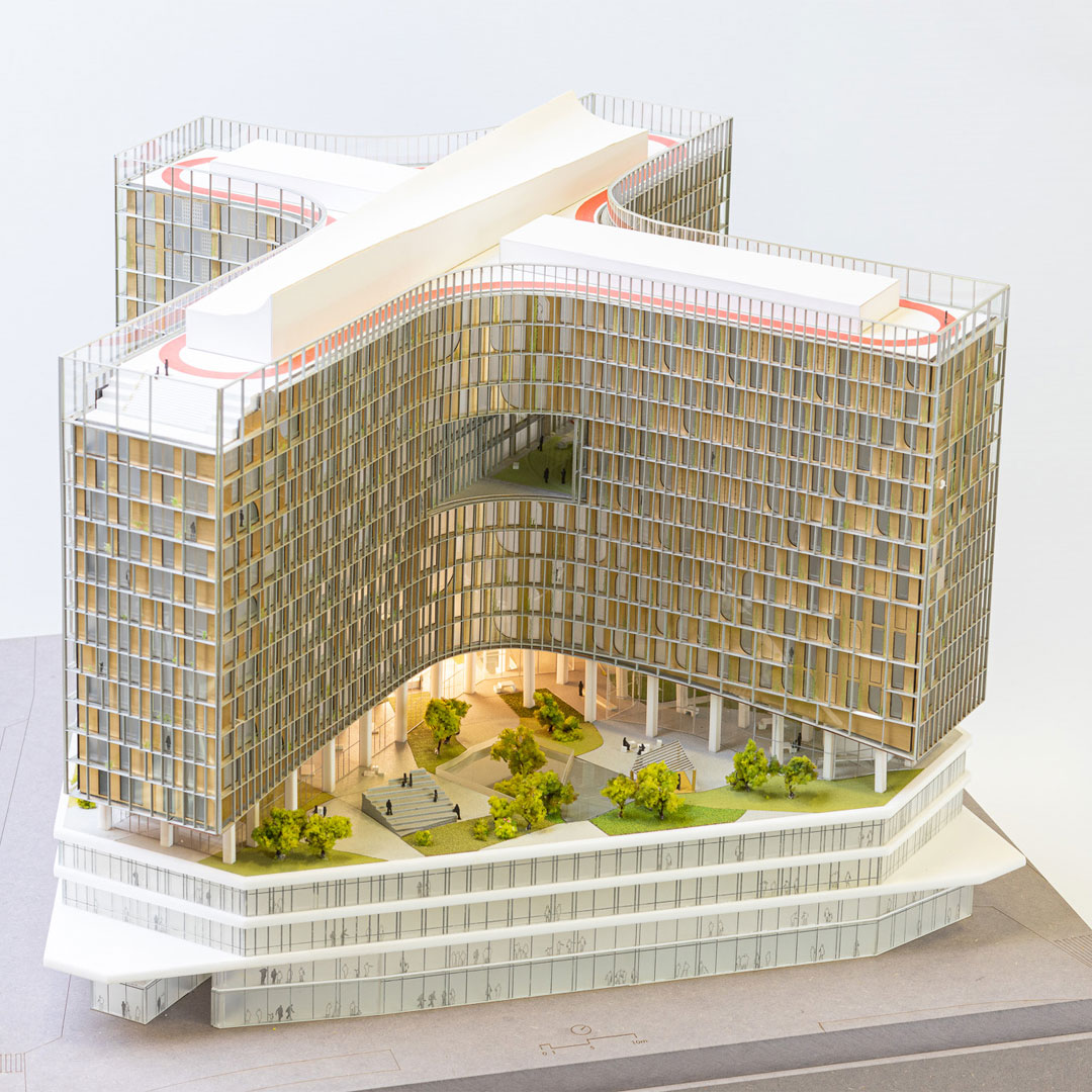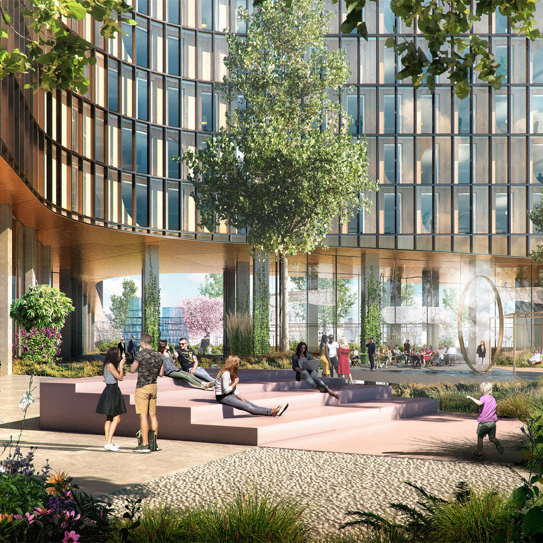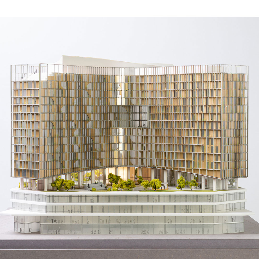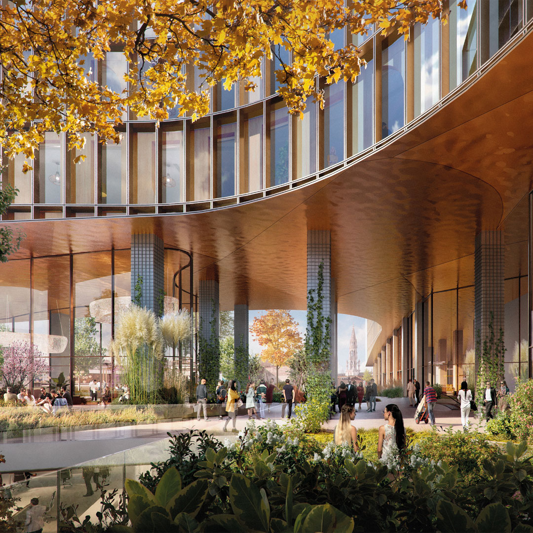 Park Mozaïek is buitenruimte én binnenruimte, met als hart een publiek park dat het totale basement van de torens beslaat. Om ruimte te maken voor deze groene zone halen we onder de benen van het gebouw twee lagen weg. Zo ontstaat een open, maar door de gebogen benen ook geborgen ruimte, van maar liefst 5000 m2. Om dat voor elkaar te krijgen ontwerpen we een reeks van gerichte ontwerpingrepen die op alle schaalniveaus leiden tot meer en betere verbindingen van deze plek met de stad rondom.