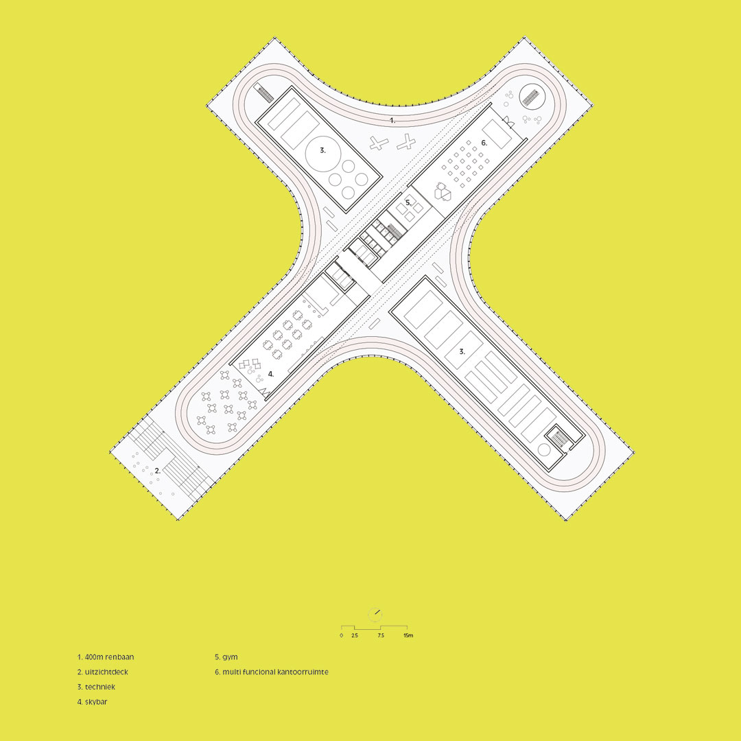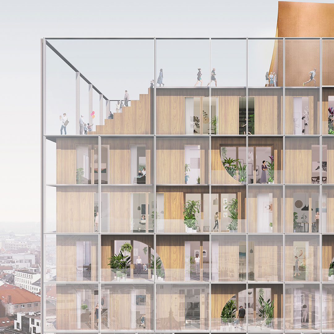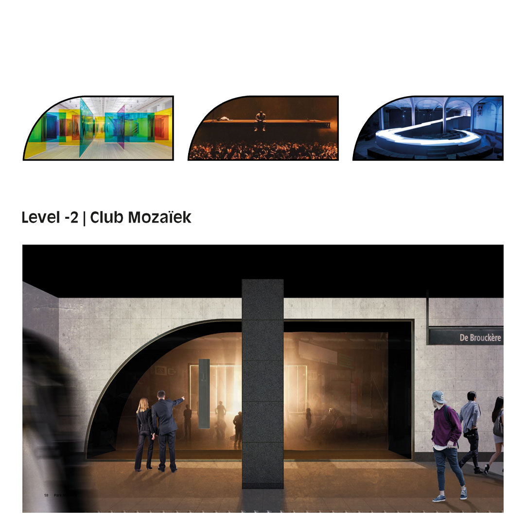 Ook andere strategische punten in het gebouw maken we open. Zo leggen we op alle schaalniveaus relaties met de stad. Club Mozaïek en het zwembad met spa in de kelder staat via een open venster in contact met de reizigersstromen van de metro. De Wonderspace vormt het communicatieve beeldmerk van en naar de stad. Op het dak ligt het BXL Observatorium en de 400 meter atlektiekbaan, beide met geweldig uitzicht over de stad. De entreepartijen vormen opvallende publieke accenten in de straatgevels van het gebouw en zijn trekkers om voorbijgangers te verleiden naar het park te gaan.