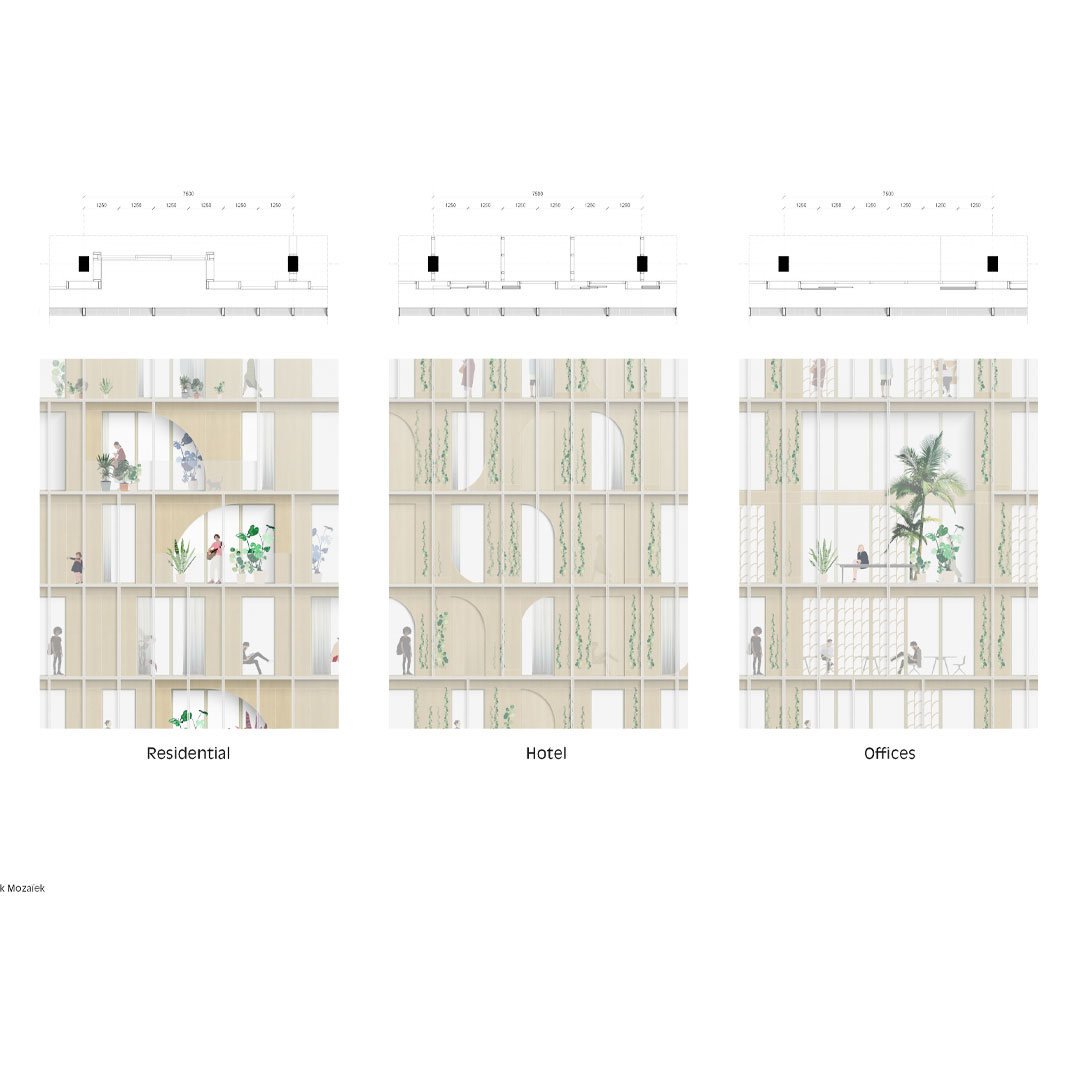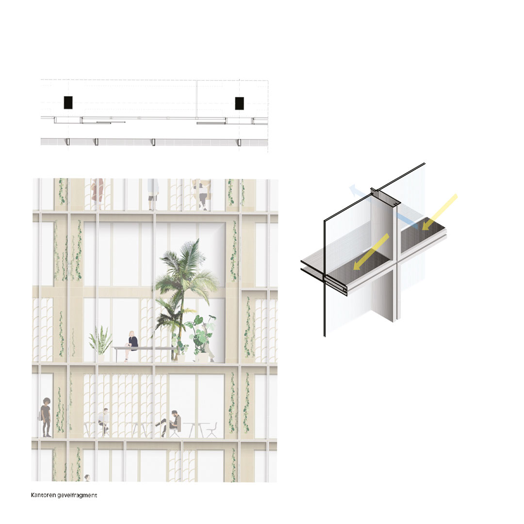 We vervangen de huidige statische gevel op subtiele wijze door een tweelaagse gevel die een relatie aangaat met de omgeving. Zo de buitengevel toont in beeld samenhang. Zo is variatie in beeld en gebruik mogelijk, bijvoorbeeld wel of geen groen, schuivende vlakken, of zonwering. Het mozaïekpatroon in de buitengevel toont in beeld samenhang en communiceert tegelijkertijd dat wat het gebouw karakteriseert: de pluriformiteit. De binnengevel is flexibel en eenvoudig demontabel bij veranderende wensen voor invulling. In de gevel zit bovendien een innovaties energetisch systeem verwerkt.