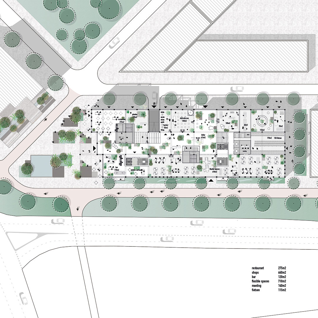 Publieke ruimte, voorzieningen, parkeren, werkruimtes, restaurant, appartementen