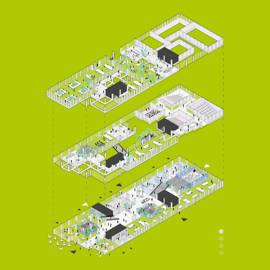 Ruimtelijk is het mogelijk om binnen de kaders vloeren en wanden aan te brengen. Echter, het weglaten ervan heeft een veel krachtiger effect: openingen, buitenruimten en vides tonen het kwalitatief hoogwaardig wonen, werken, consumeren en recreëren in het complex.