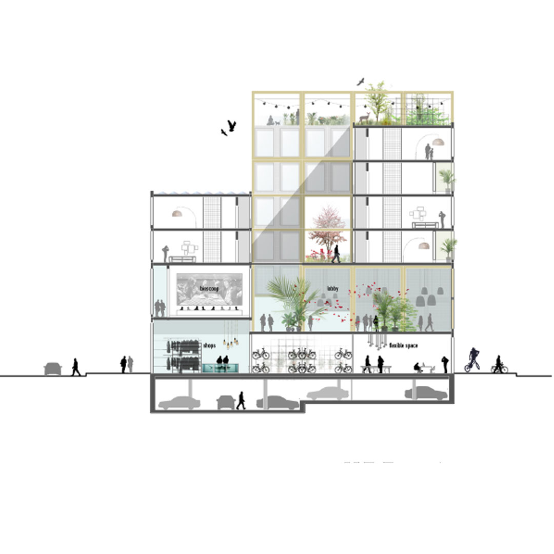 Met een vrij indeelbare constructie is voor een ambitieuze doelgroep een mixed-use gebouw ontworpen met een zichtbaar collectief en groen karakter. REBEL is niet geselecteerd voor realisatie maar uitermate trots presenteert het team, bestaande uit Synchroon, Studioninedots, DELVA Landscape Architects, Skonk, Techniplan en Eigen Haard, het concept en het ontwerp dat zij voor de tender indiende.