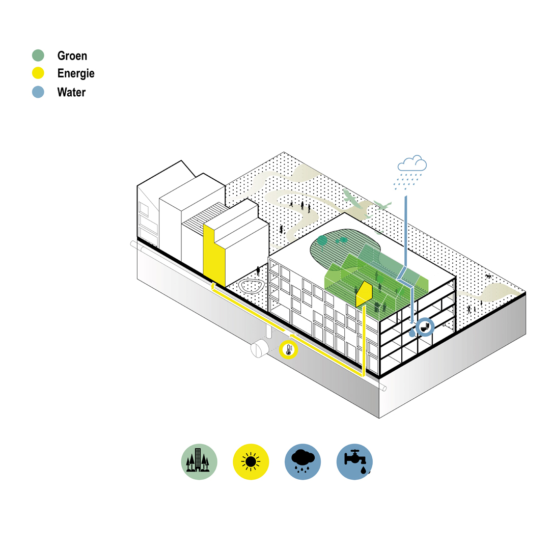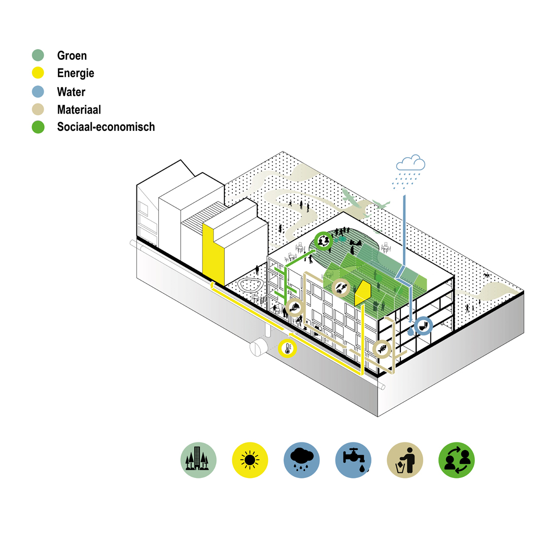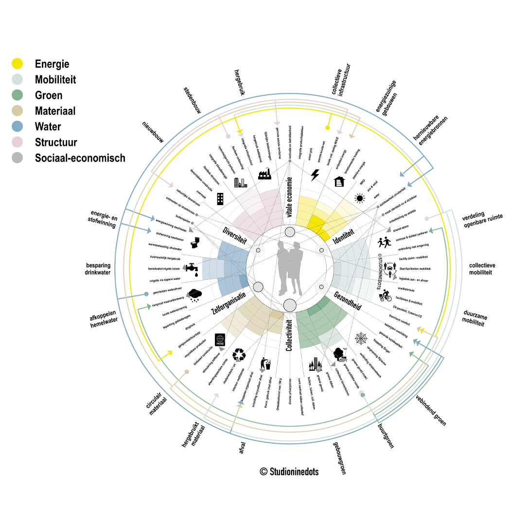 Voor het optimaal laten functioneren van delen van de stad opteert Studioninedots voor een zoveel mogelijk zelfvoorzienend systeem. Met de focus op een zo groot mogelijke levenskwaliteit fungeert de circulaire wijk als een collectieve machine waarbij water-, groen-, materiaal-, energie- en voedselsystemen met elkaar worden gekoppeld en samenkomen. De focus ligt op kringloopsystemen die bijdragen aan een zelflerende en toekomstbestendige wijk. Het sluiten van kringlopen maakt ons onafhankelijk van schaars wordende grondstoffen en daarmee zelfstandig.