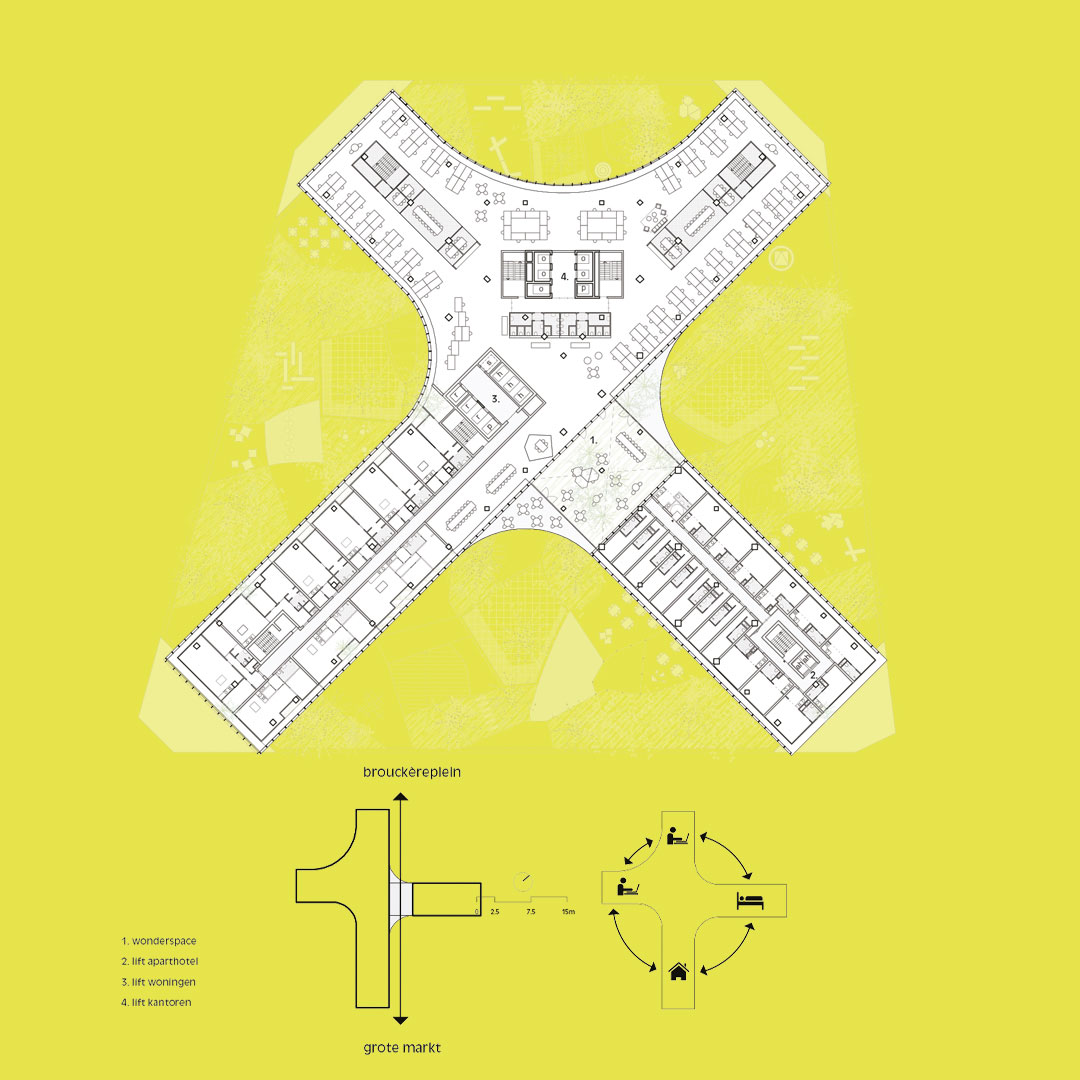 Ook andere strategische punten in het gebouw maken we open. Zo leggen we op alle schaalniveaus relaties met de stad. Club Mozaïek en het zwembad met spa in de kelder staat via een open venster in contact met de reizigersstromen van de metro. De Wonderspace vormt het communicatieve beeldmerk van en naar de stad. Op het dak ligt het BXL Observatorium en de 400 meter atlektiekbaan, beide met geweldig uitzicht over de stad. De entreepartijen vormen opvallende publieke accenten in de straatgevels van het gebouw en zijn trekkers om voorbijgangers te verleiden naar het park te gaan.