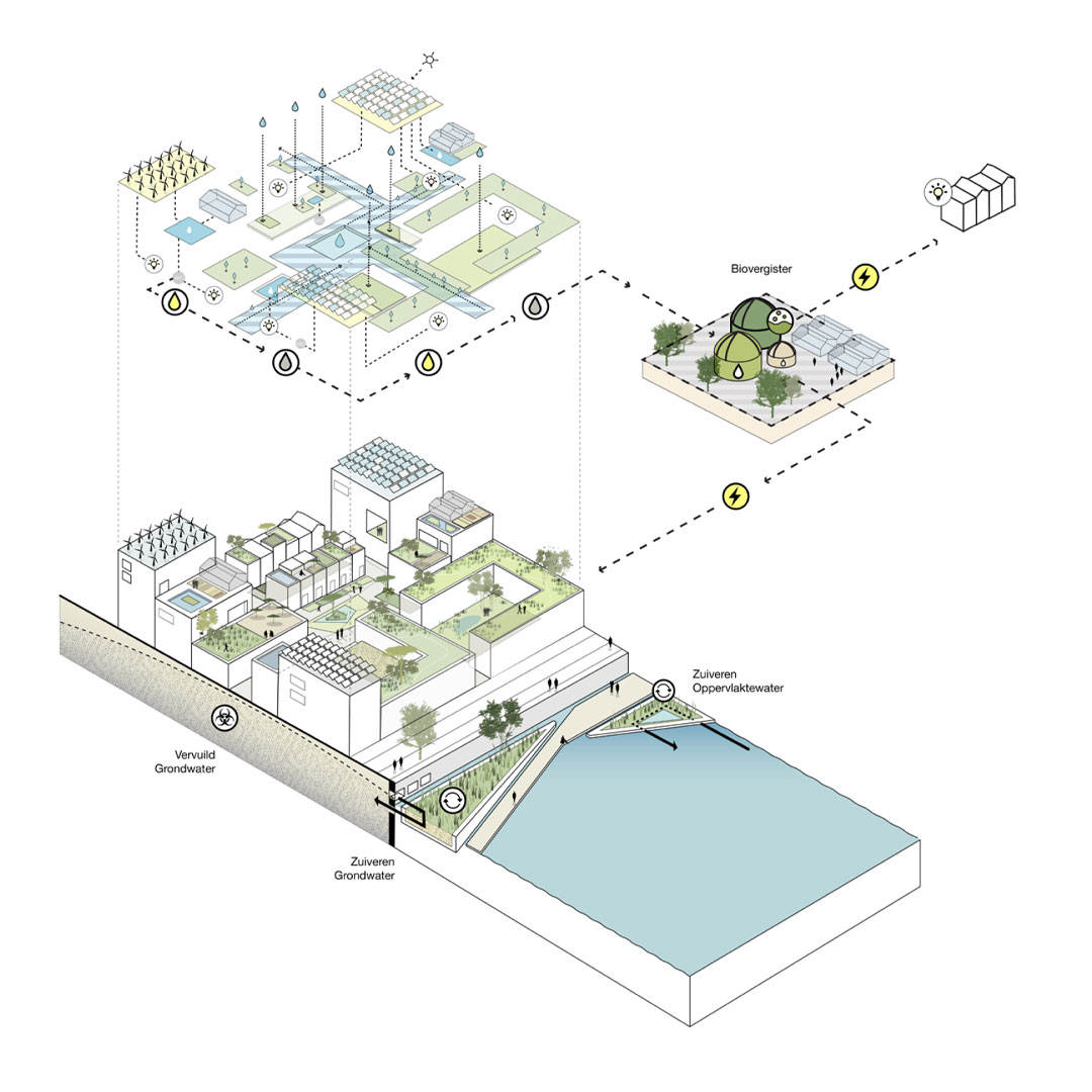 Regenwater wordt opgevangen in daktuinen, wadi’s en infiltratiekratten en gevoed aan het Tolhuiskanaal. De openbare ruimte is ontworpen als een verbonden landschap van biodiversiteit, beleving en klimaatadaptatie.