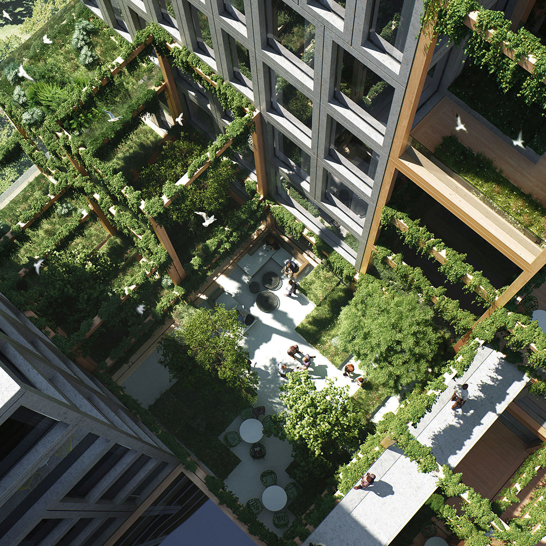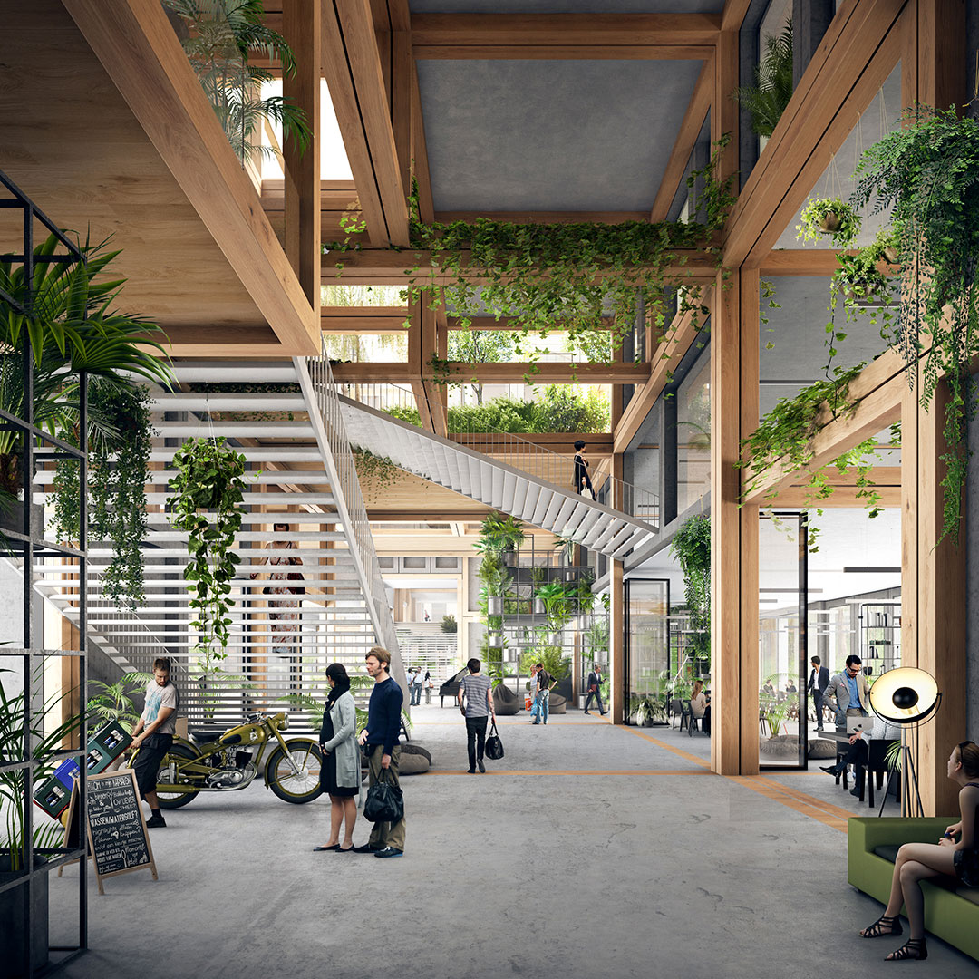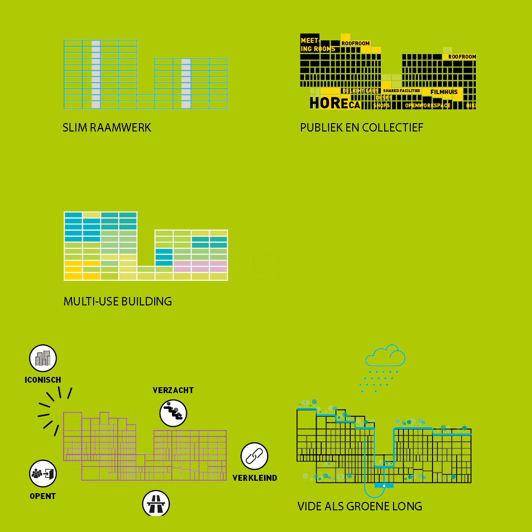 Ruimtelijk is het mogelijk om binnen de kaders vloeren en wanden aan te brengen. Echter, het weglaten ervan heeft een veel krachtiger effect: openingen, buitenruimten en vides tonen het kwalitatief hoogwaardig wonen, werken, consumeren en recreëren in het complex.
