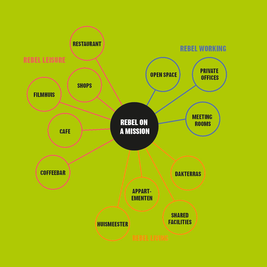 REBEL is de plek voor rebels on a mission; dynamische stedelingen op zoek naar een locatie waar wonen, werken en ontmoeting samenkomen en waar interactie centraal staat. REBEL biedt dan ook een bruisende mix van commerciële en cultureel maatschappelijke functies. Uiteenlopende woontypologieën zijn er gecombineerd met branded offices en kleinere officeunits. De begane grond van REBEL is dé plek voor interactie. Deze stedelijke huiskamer is dé ontmoetingsplek voor zowel de gebruikers en bewoners van het gebouw als voor de buurt en wordt daarom zowel overdag als ‘s avonds geactiveerd. Vanuit hier zijn het filmhuis, het restaurant, de coffeebar met werkplekken en winkels te bereiken. Bewoners en gebruikers delen er auto’s en fietsen.