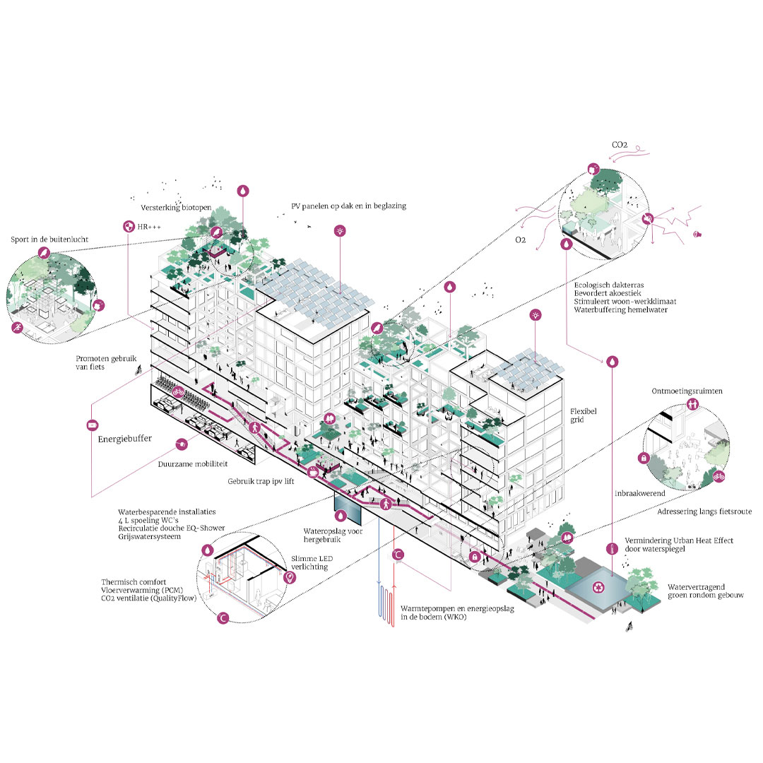 De zichtbaarheid van het groen en de maatregelen voor optimale luchtkwaliteit en circulair watergebruik versterken het natuur-inclusieve en gezonde ontwerp. REBEL is geen anoniem gebouw maar toont overdag en ’s avonds zijn duurzaam en divers gebruik.